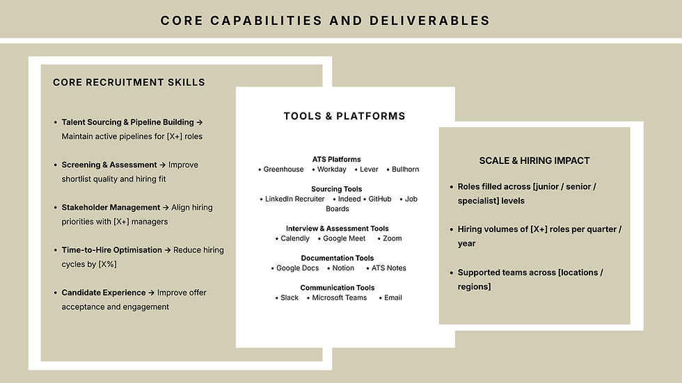 A structured breakdown of your core skills, tools, and methods, framed in language recruiters and clients actually scan for.